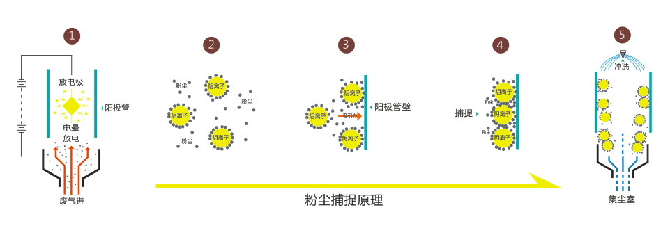 在电场力的作用下,整个沉淀极管内部都形成电晕区,在电晕区内,高浓度的负离子(电子)从电晕电极源源不断地向沉淀极管做定向运动从而形成电晕电流。当含有水雾、粉尘及其他污染物的烟气进入沉淀极管时,由于离子的碰撞和扩散,水雾、粉尘和污染物荷电,然后在电场力的作用下迅速抵达沉淀极管的内壁并同时释放出电荷,在沉淀极管内壁形成液膜,液膜、粉尘和污染物在重力作用下流到静电除雾器下部的集液槽中集中处理,从而达到捕集烟气中雾滴、粉尘和其它污染物的目的。