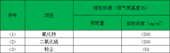 (8)排放标准,执行以下排放要求:二氧化硫浓度<200mg/m3 ,氟化物浓度<200mg/m3,粉尘浓度<50mg/m3并具有可满足更高标准的调节裕量。